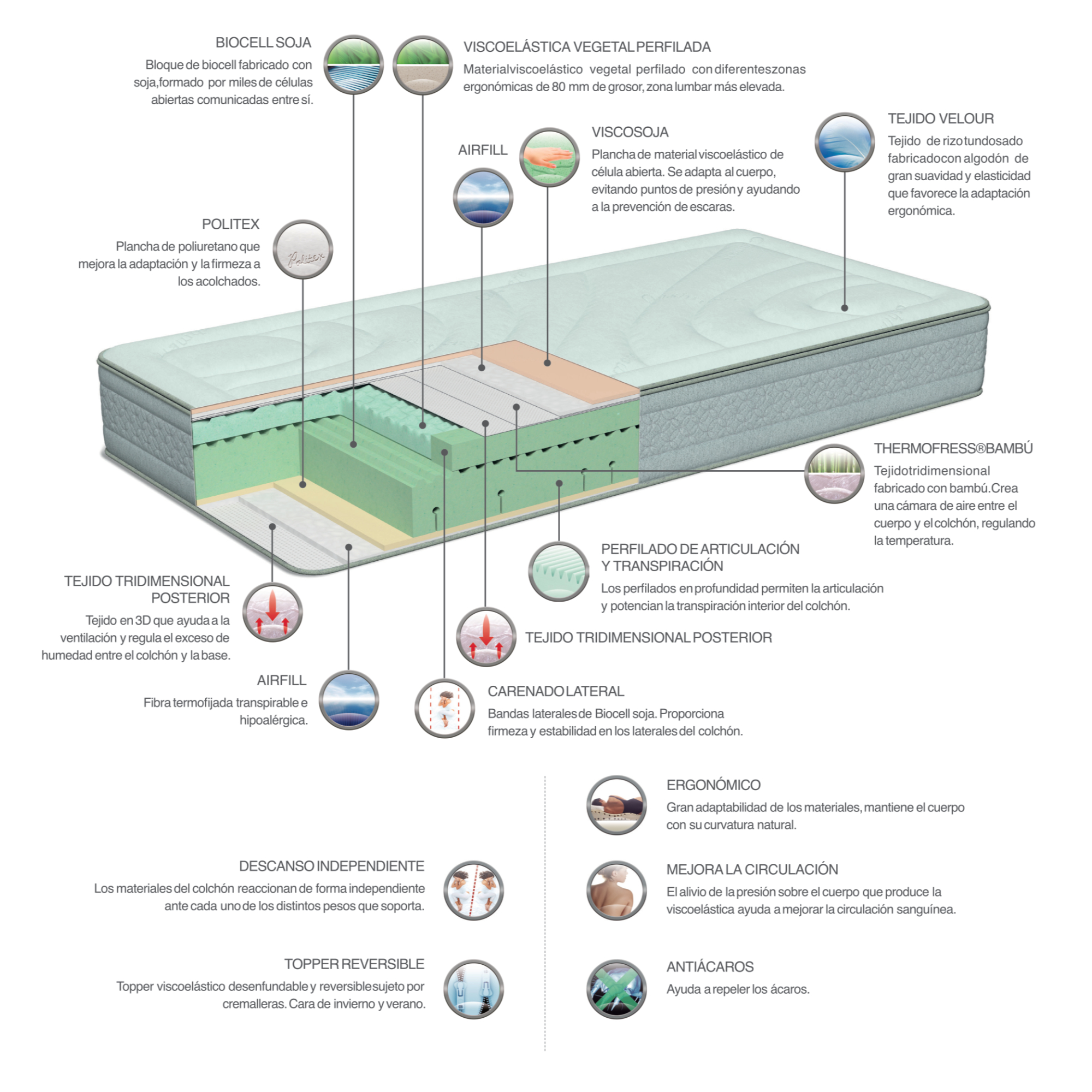 - THERMOFRESS® BAMBÚ Tejido tridimensional fabricado con bambú. Crea una cámara de aire entre el cuerpo y el colchón, regulando la temperatura.