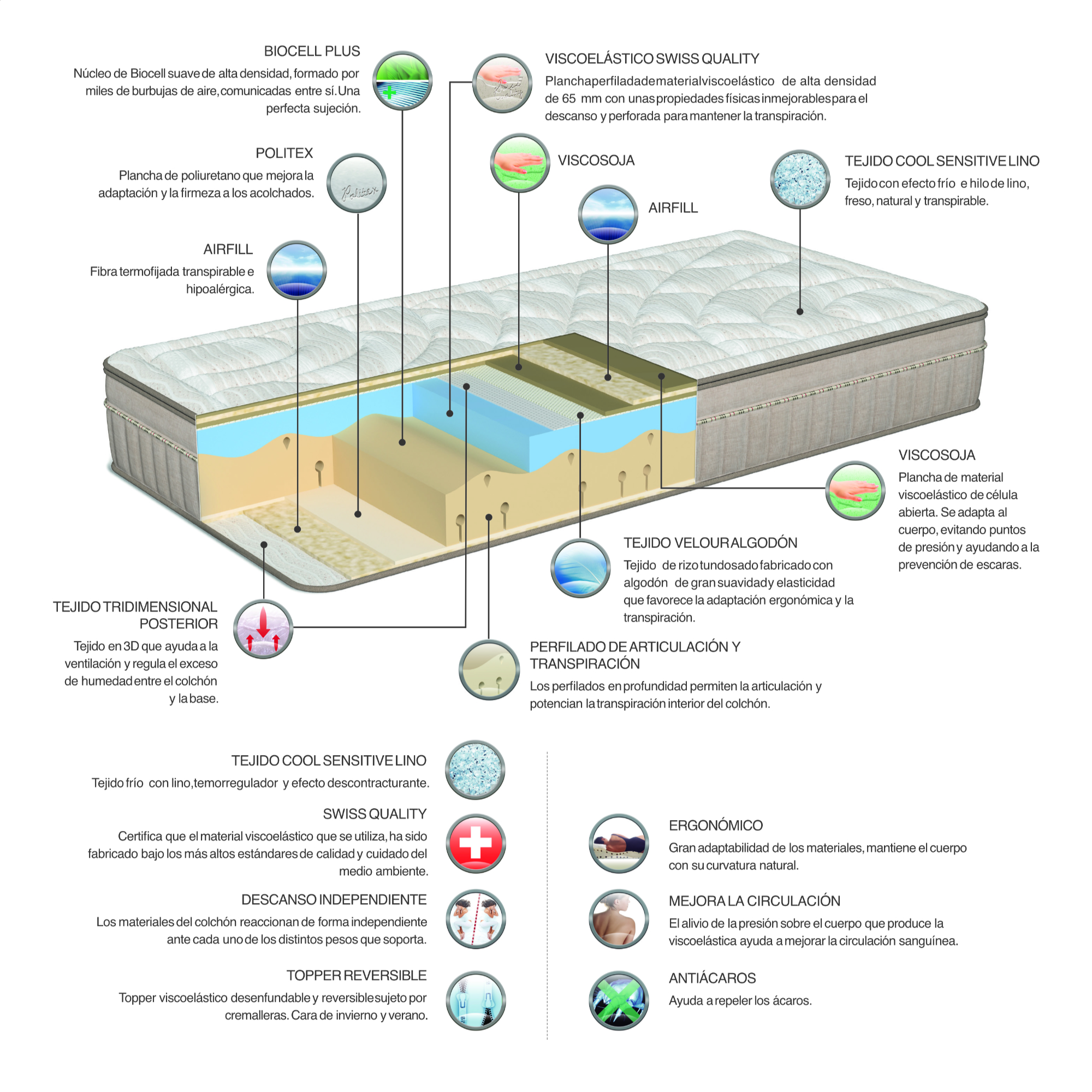 - TEJIDO COOL SENSITIVE LINO: tejido frío con lino, termorregulador y efecto descontracturante.