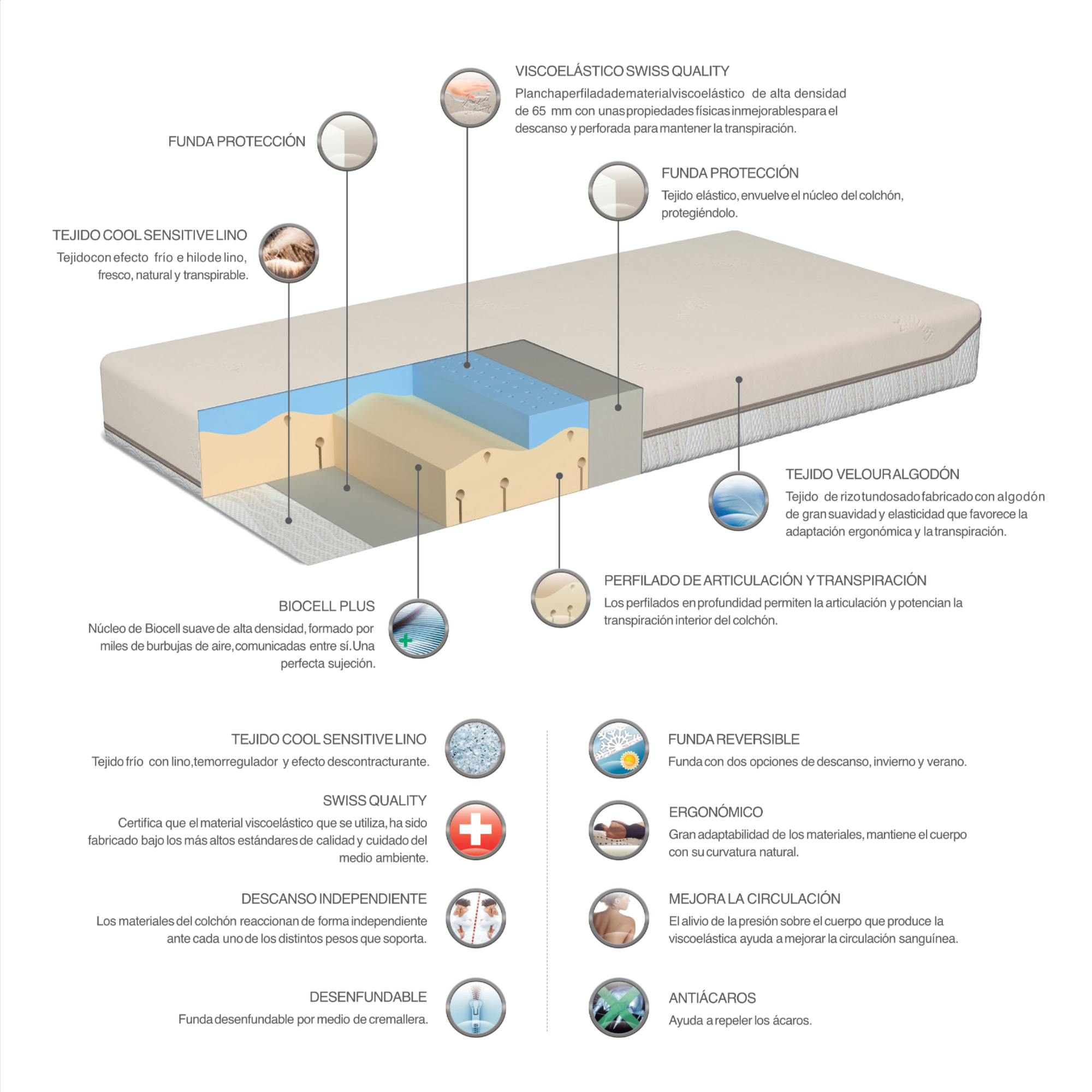 Colchón con núcleo viscoelástico, material termosensible de célula abierta de última generación, reacciona a la temperatura corporal, ajustándose de manera óptima a nuestro cuerpo, aumentando la superficie de apoyo y reduciendo los puntos de presión, lo que facilita la circulación sanguínea. Su estructura celular abierta permite la libre circulación del aire y transpiración, manteniendo un descanso saludable. Desarrollados en el ámbito sanitario para pacientes que pasaban mucho tiempo en cama, se han implantado rápidamente en el sector del descanso de hogar.